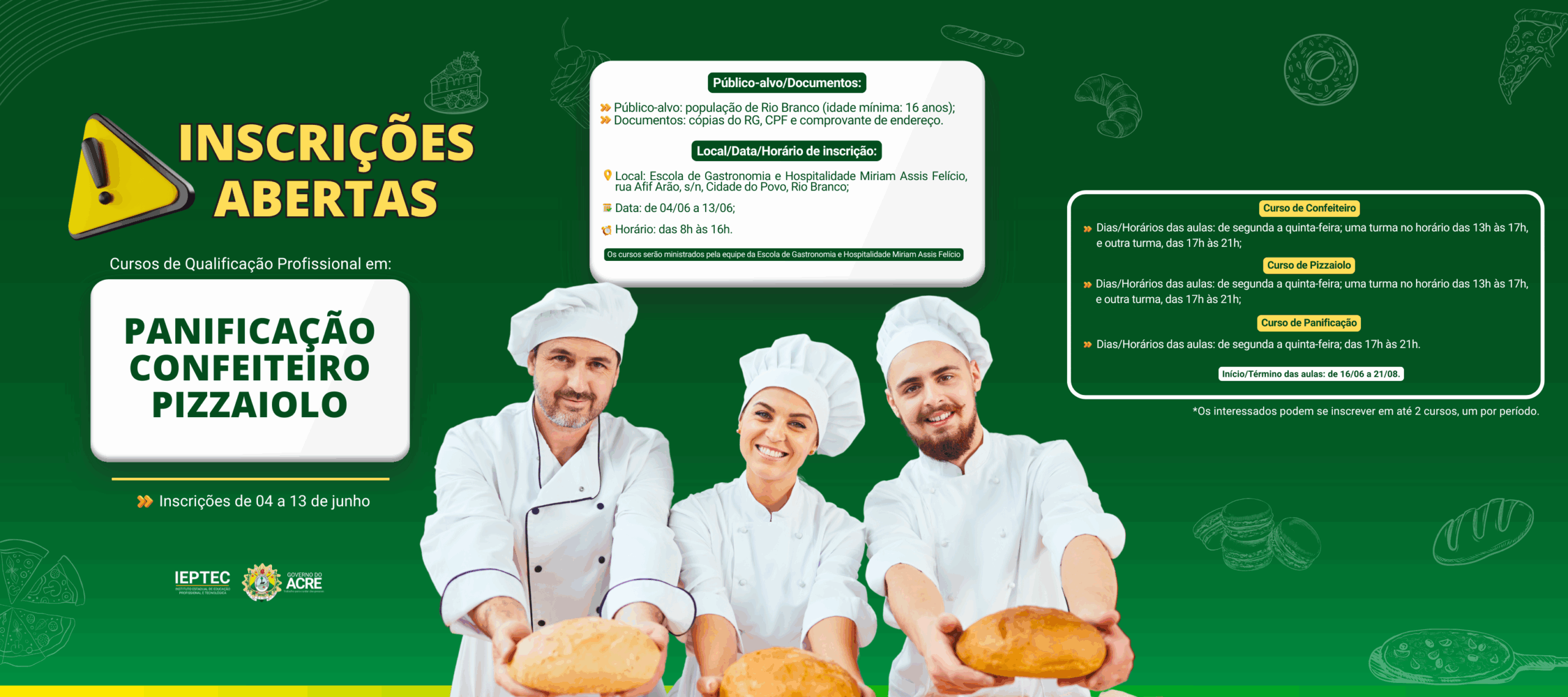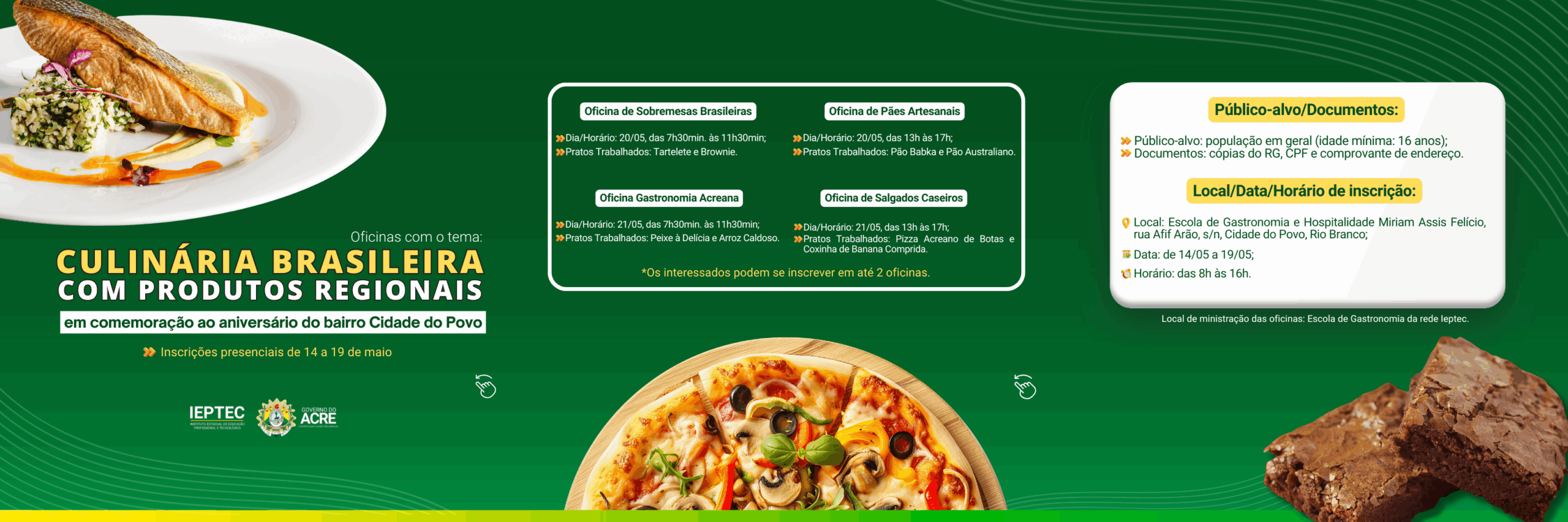 📢 OFICINAS DE CULINÁRIA BRASILEIRA COM PRODUTOS REGIONAIS 🥘🍕🥖Em comemoração ao aniversário do conjunto habitacional Cidade do Povo no dia 23 de maio, o governo do Acre, por meio do Instituto Estadual [...]