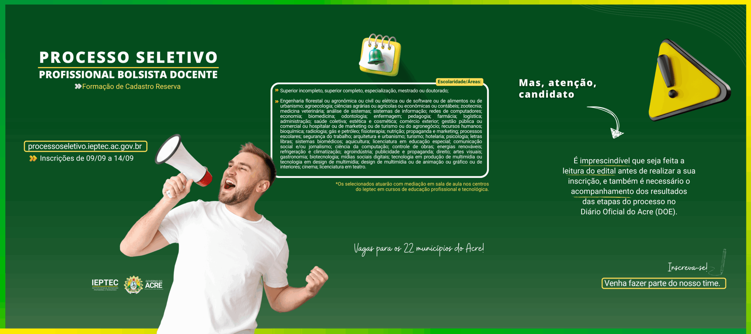 ⚠️ ATENÇÃO!! INSCRIÇÕES ABERTAS PARA PROFISSIONAL DOCENTE BOLSISTA HORISTA ⚠️O Instituto Estadual de Educação Profissional e Tecnológica (Ieptec) lança [...]