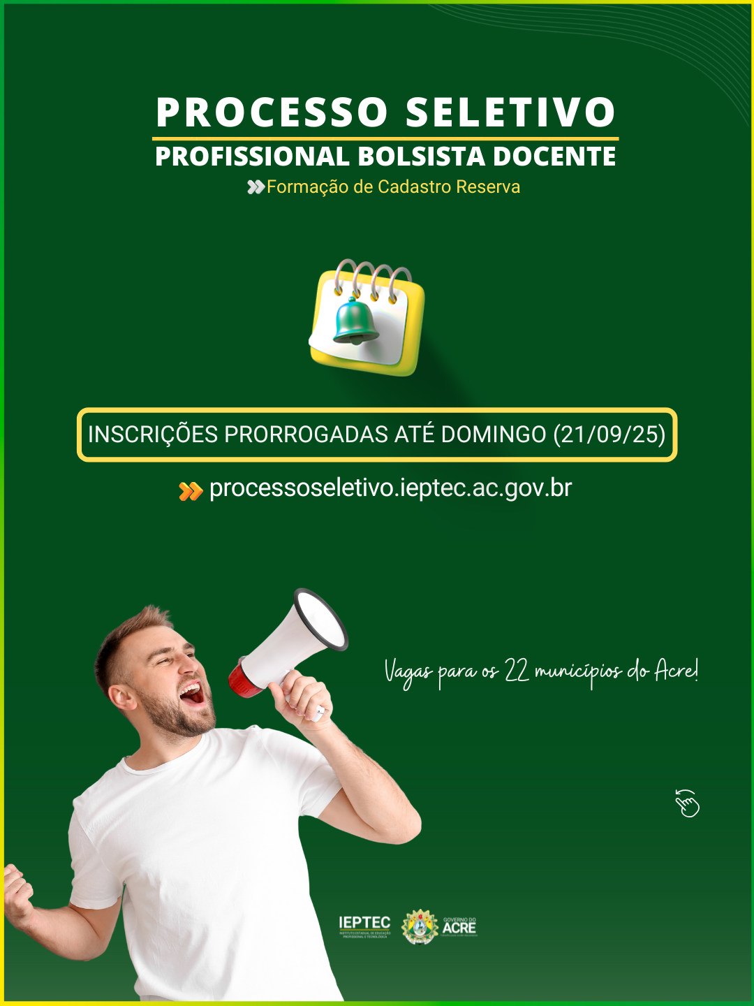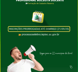 Foi publicado no Diário Oficial do Acre (DOE) desta quarta-feira, 17, a prorrogação das inscrições no processo seletivo simplificado para formação de cadastro reserva de profissionais bolsistas [...]